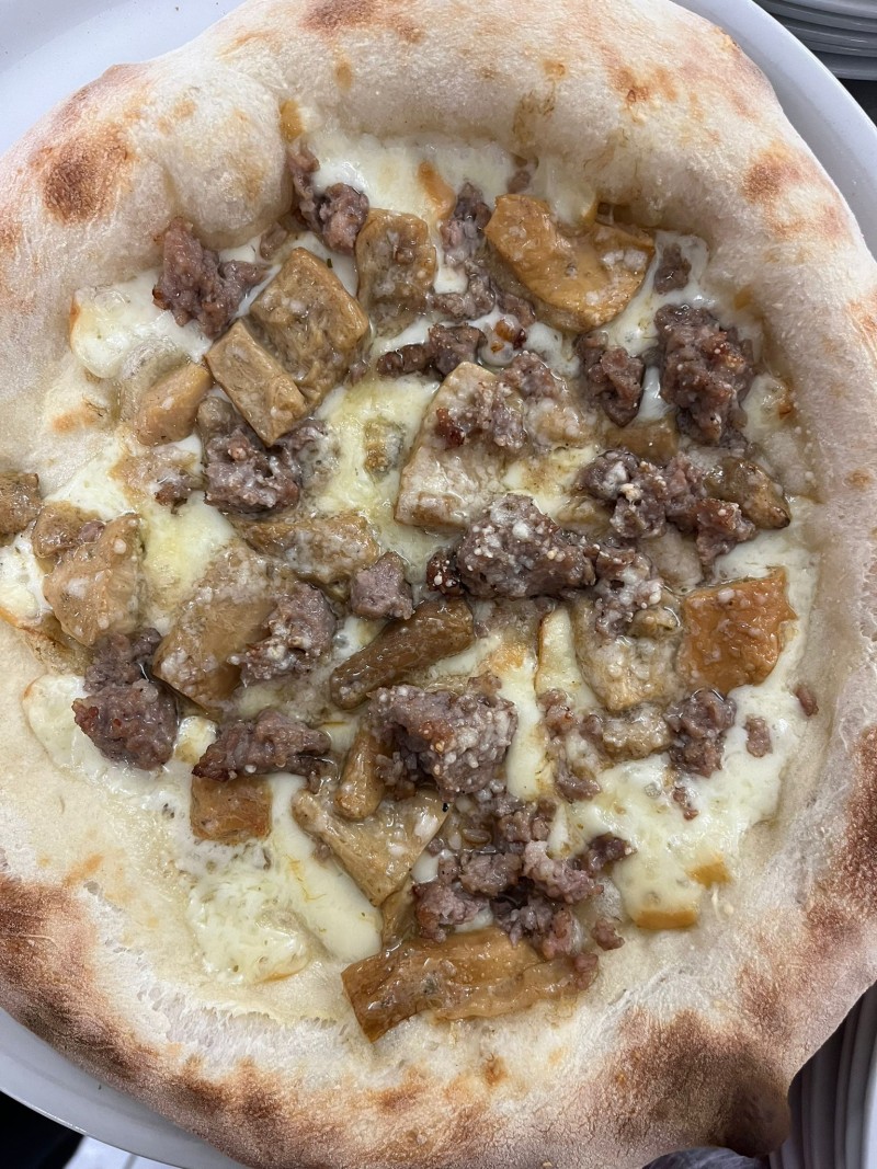 Crema di funghi porcini, patate al forno con rosmarino, tartufo , salsiccia CLAI , mozzarella fior di latte affumicata, basilico e pepe nero. Semplice, gustosa, senza barriere.